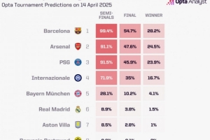 巴萨在欧冠1/4决赛首回合比赛中主场4-0大胜多特蒙德,目前成为了最大的夺冠热门(28.2%)。 而阿森纳在主场以3-0击败皇马,成为第二夺冠热门(24.5%)。在进行了多次模拟后,巴萨(54.7%)和阿森纳(47.6%)成为了最多次进入决赛的两支球队。